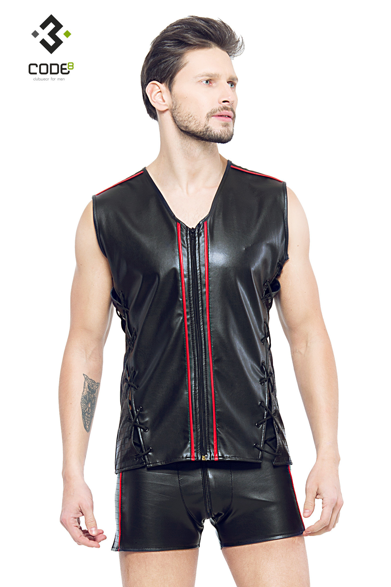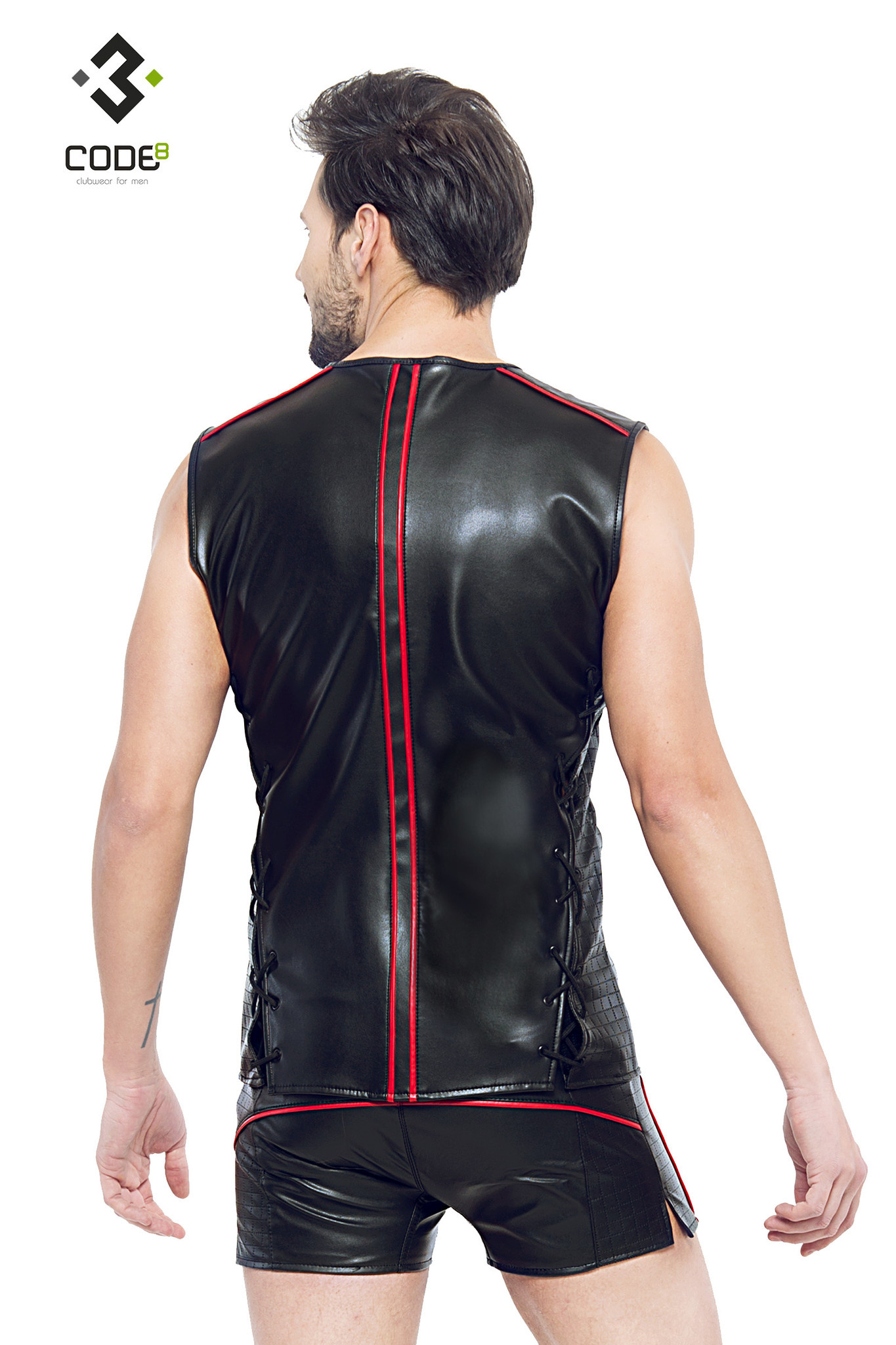 Eco-leder mouwloos shirt met rood gekleurde biezen