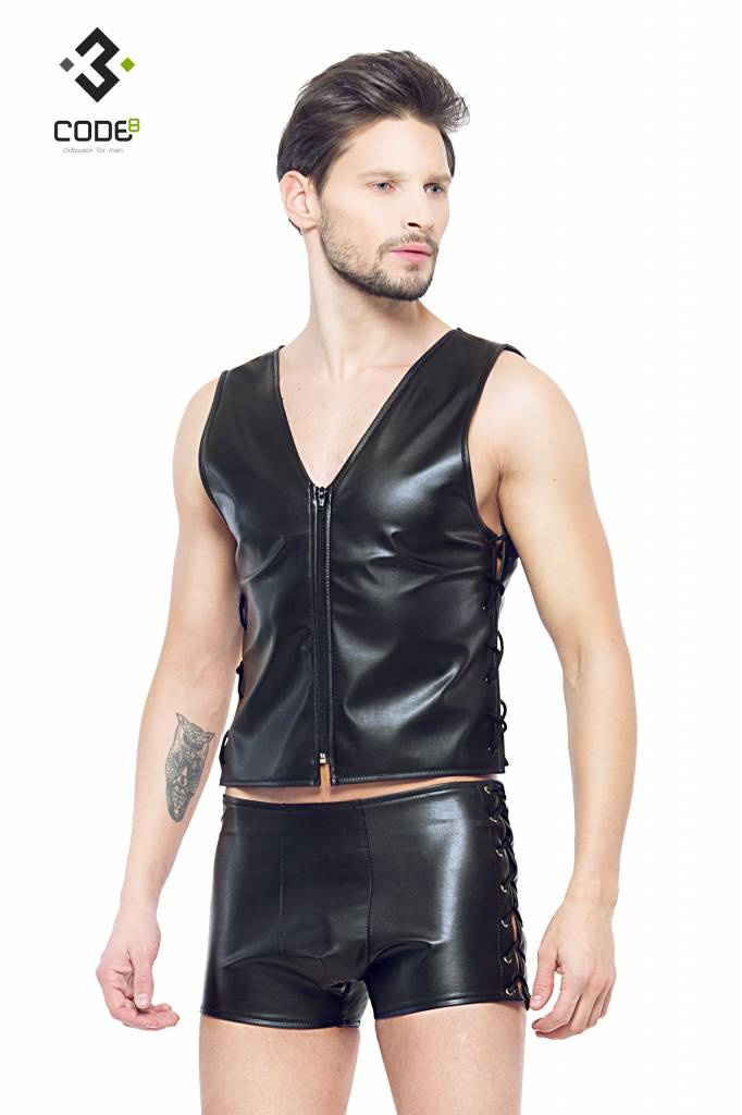 Een cool Eco-Leren waistcoat met diepe V-hals en een ritssluiting aan de voorzijde en veters aan de zijkanten.