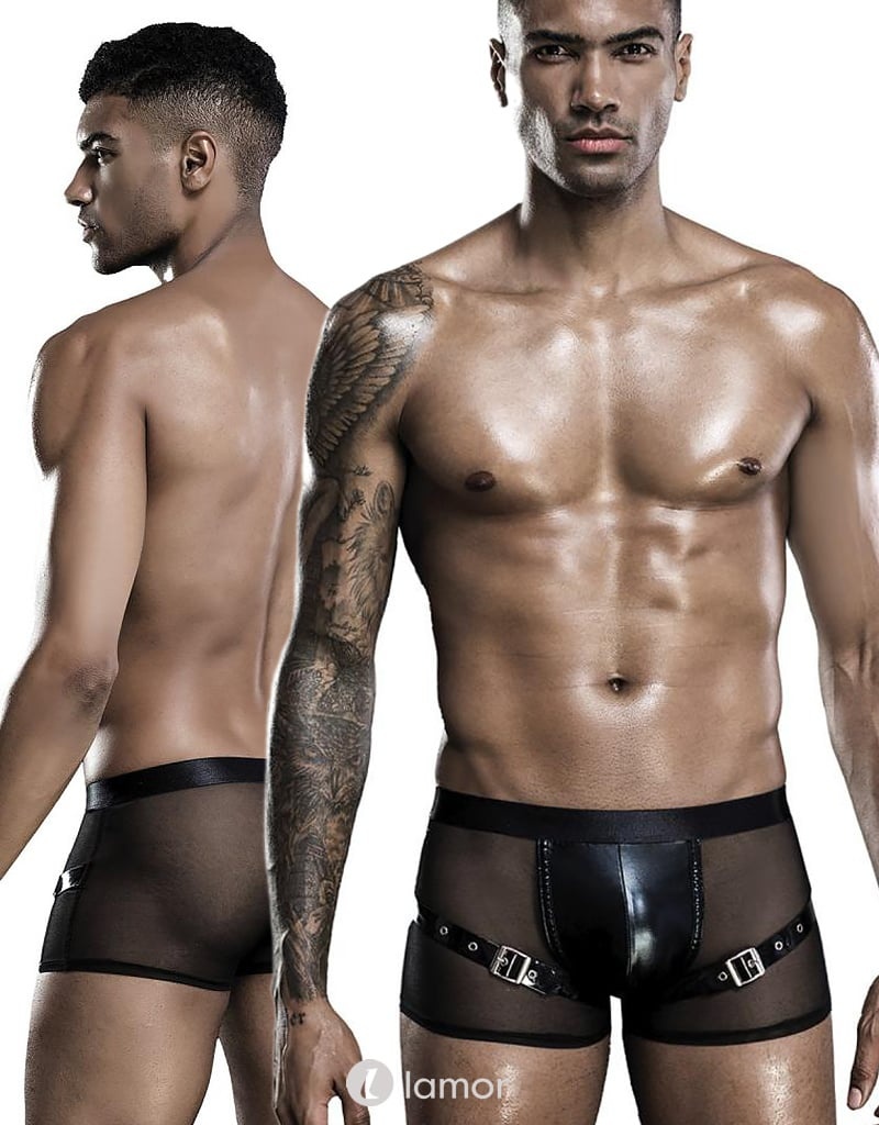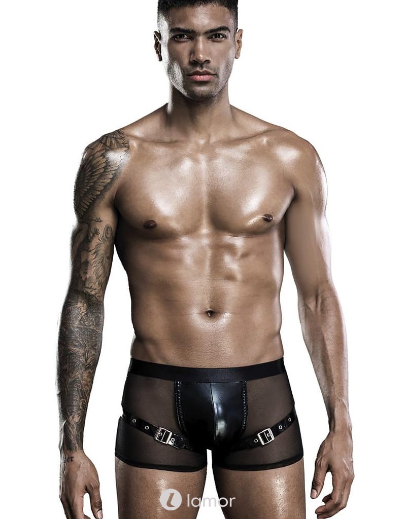 Zwarte heren boxer van Saresia. Met elastische tailleband in combinatie van rekbaar wetlook en tulle zij en achterkant en tule inzetstukken.