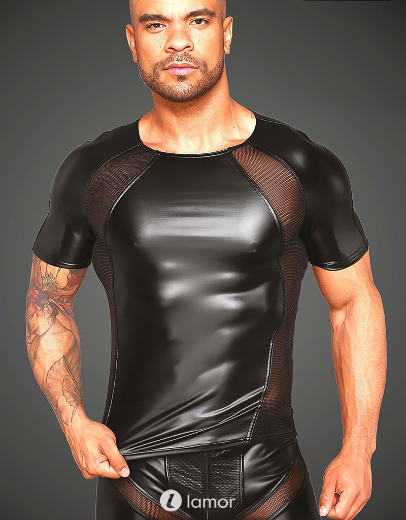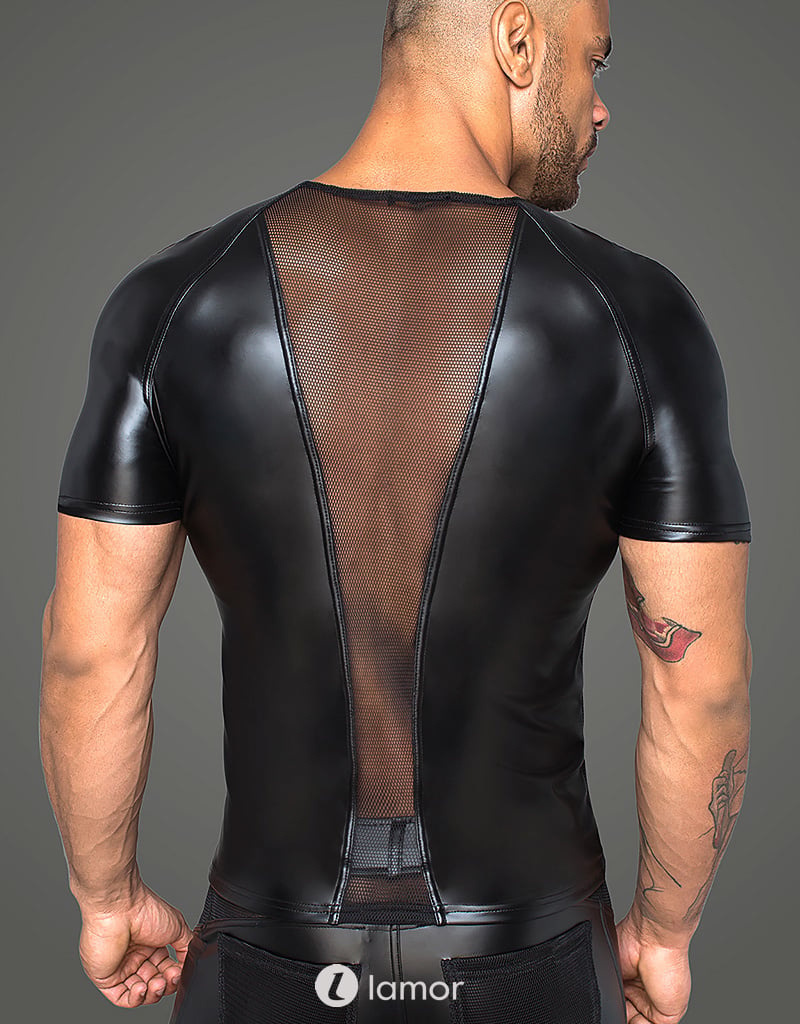 Het wetlook mesh overhemd van Noir Handmade zit strak op het lichaam en brengt daardoor je spieren optimaal tot hun recht. In de elastische power matte wetlook ziet het shirt er niet alleen extreem verleidelijk uit, het is ook ongelooflijk aangenaam voor de huid. Het is klassiek met een ronde halslijn en korte mouwen, terwijl mesh inzet aan de voor- en achterkant aantrekkelijke inzichten bieden.