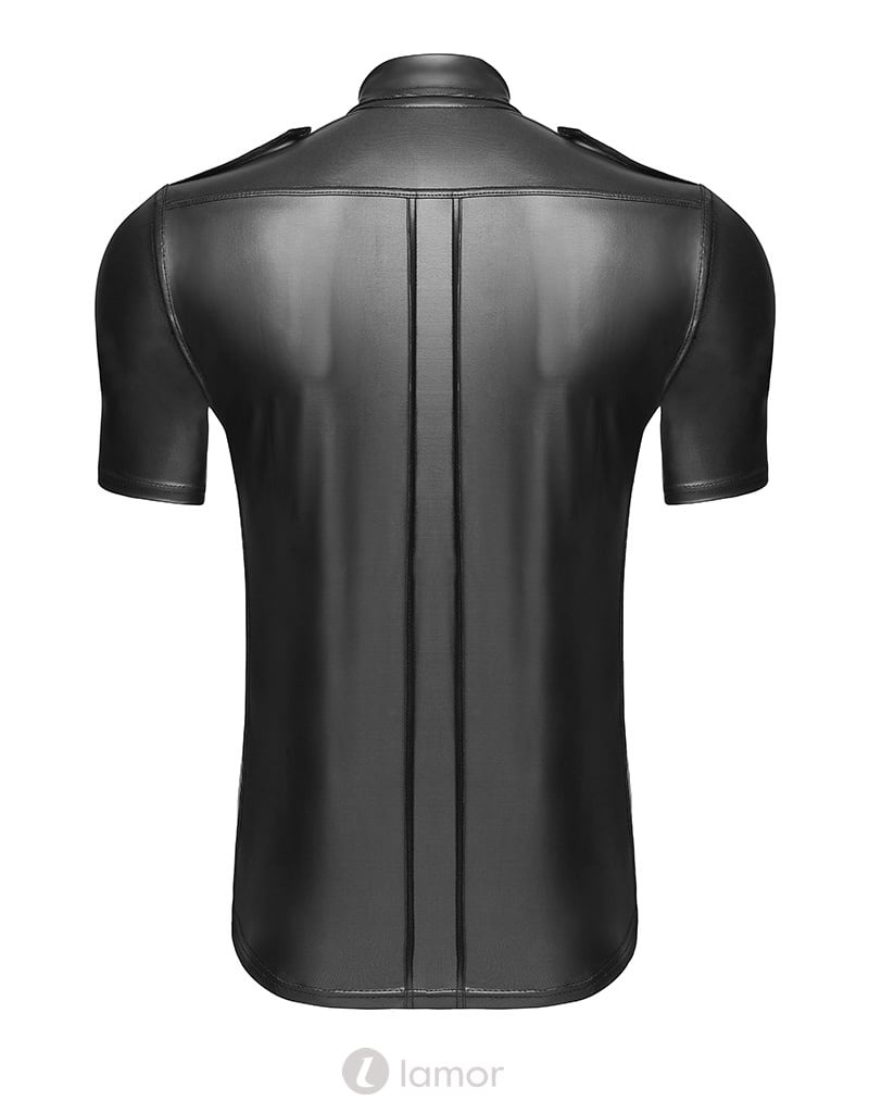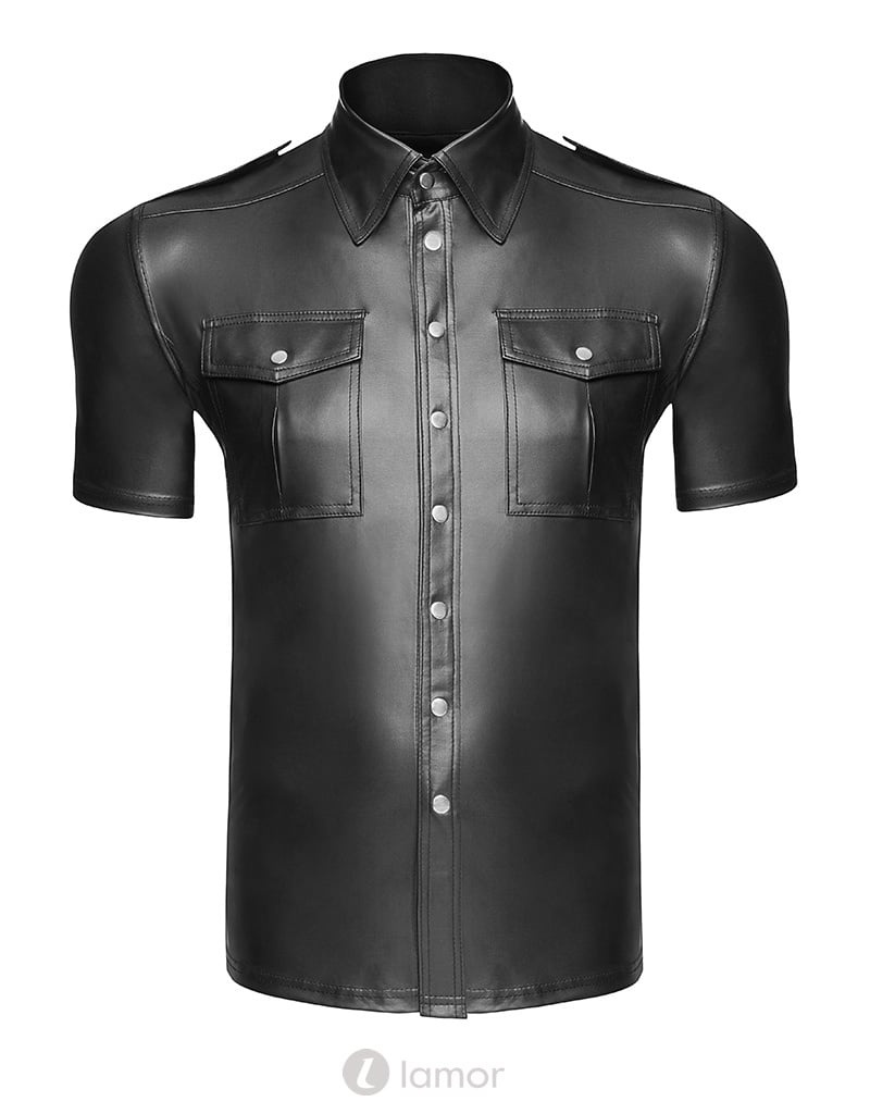 Chique shirt met korte mouwen van Noir Handmade gemaakt van een mat wetlook materiaal. Het nauwsluitende model benadrukt je sexy figuur. De twee borstzakken en de epauletten geven het shirt een duidelijk gestructureerde lijn die bijna doet denken aan een uniform. Het shirt wordt afgesloten met een reeks drukknoppen.