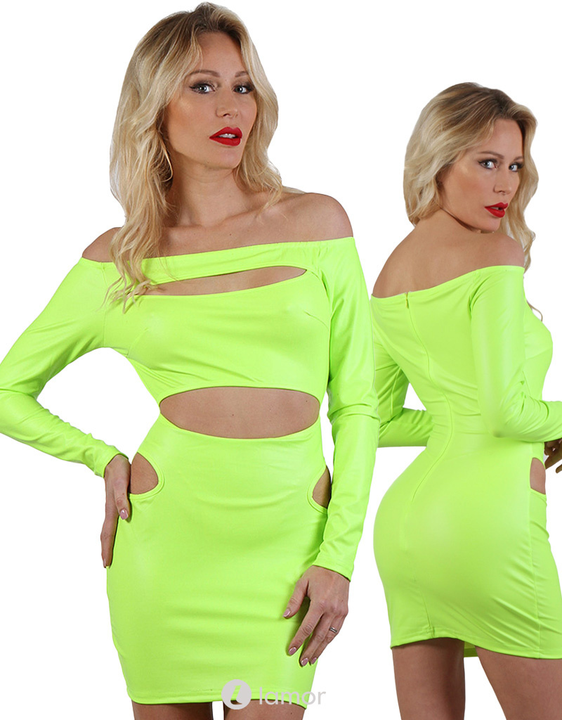 Wetlook Neon geel mini jurk met carmen halslijn