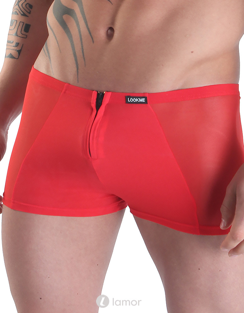 Rode boxershort WIZ voor mannen van LOOK ME. De voor- en achterkant zijn gemaakt van zachte, licht rekbare en ondoorzichtige stof. Aan de zijkanten is transparant tule materiaal gebruikt. De ingezette ritssluiting aan de voor- en achterkant is het hoogtepunt van dit product