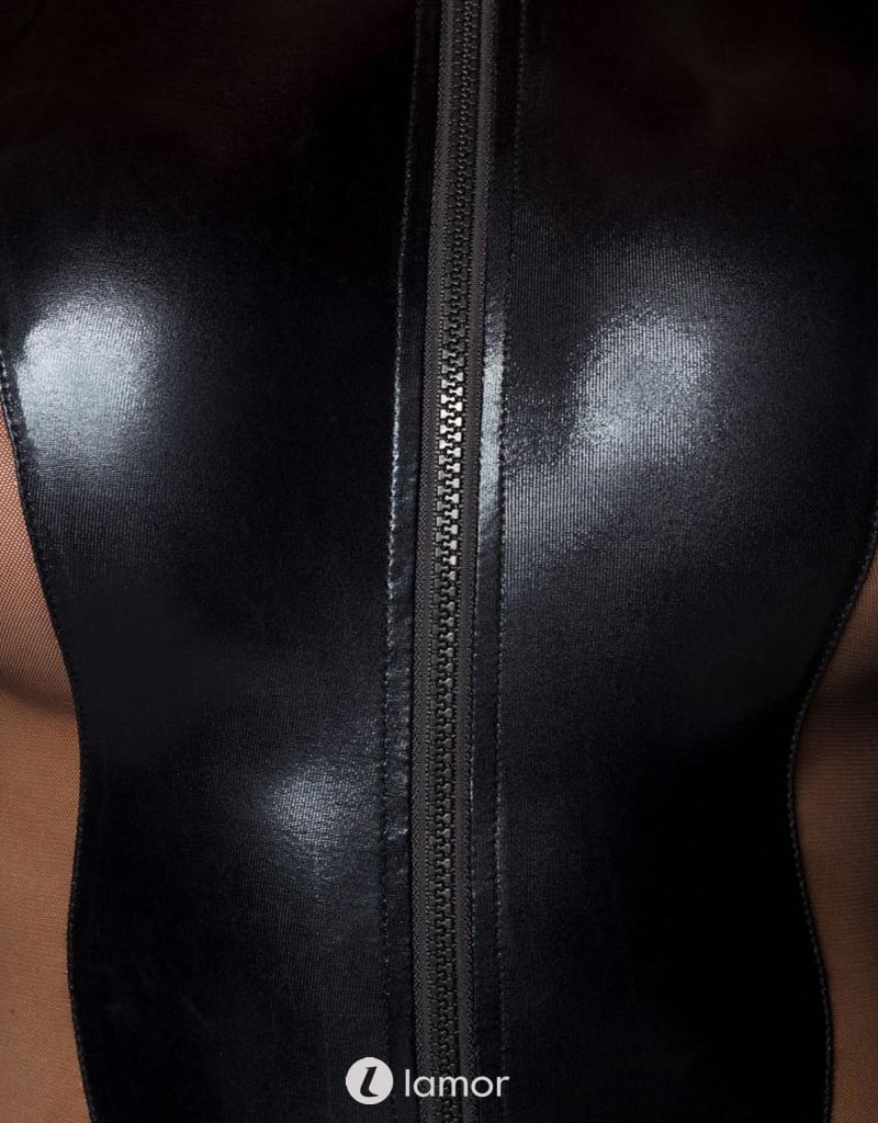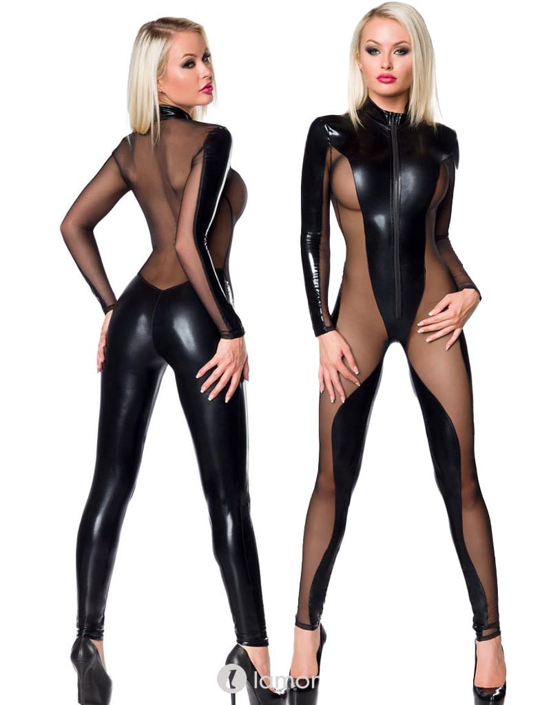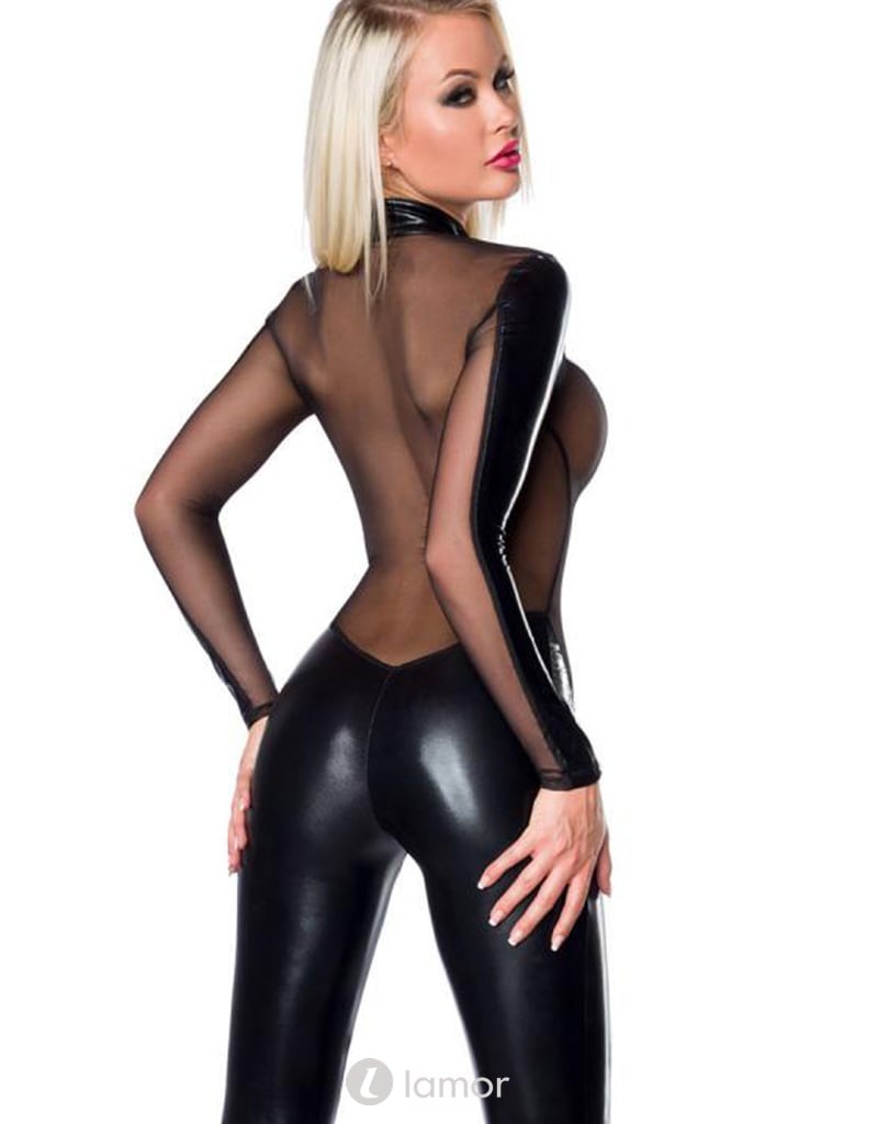 Sexy zwarte jumpsuit gemaakt van een mix van wetlook en stretchy tule materiaal, met rits aan de voorkant.