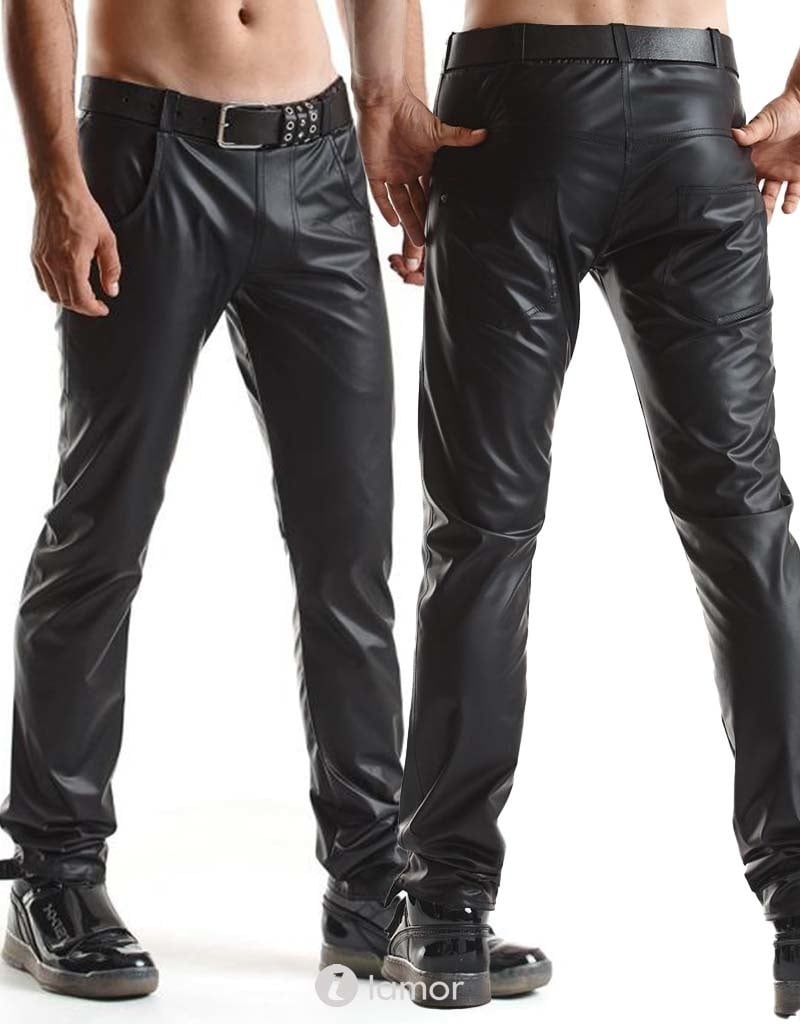Lage taille broek. Geheel gemaakt van elastisch, zwart wetlook materiaal. Ze zien er fenomenaal uit. De lage taille, smallere heuplijn benadrukken sensueel de vorm van de billen. De achterzakken zijn ook verlaagd om hun vorm nog meer te benadrukken. Zakken aan de voor- en achterkant zijn een praktische oplossing. De broek heeft riemlussen. Rode alcantara-patch met lasergebrand RFP-logo en rode stiksels benadrukken het unieke karakter van het product. .