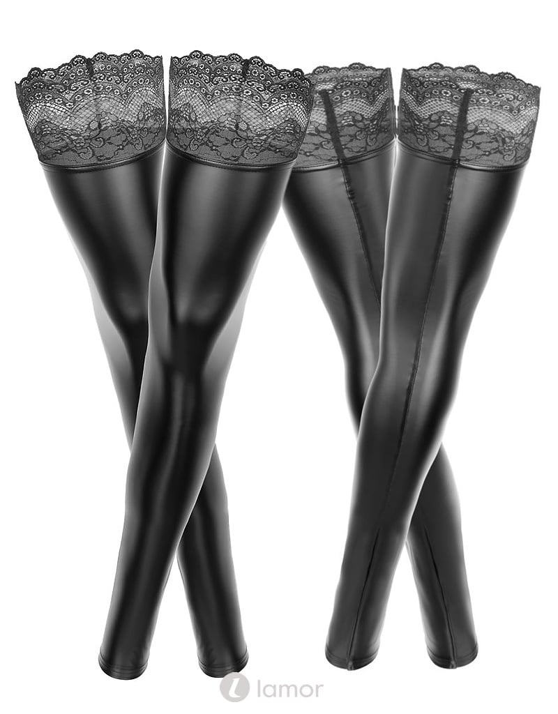 Sexy power wetlook en kanten kousen voor een klassieke boudoir look. Perfect voor de slaapkamer of een avondje in de stad.