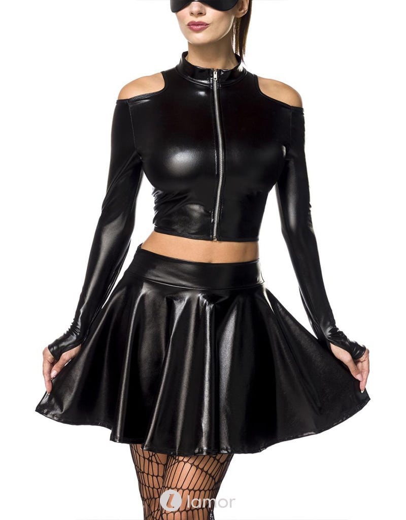 Glanzende Wetlook Top met Uitsparingen en Hoge Kraag