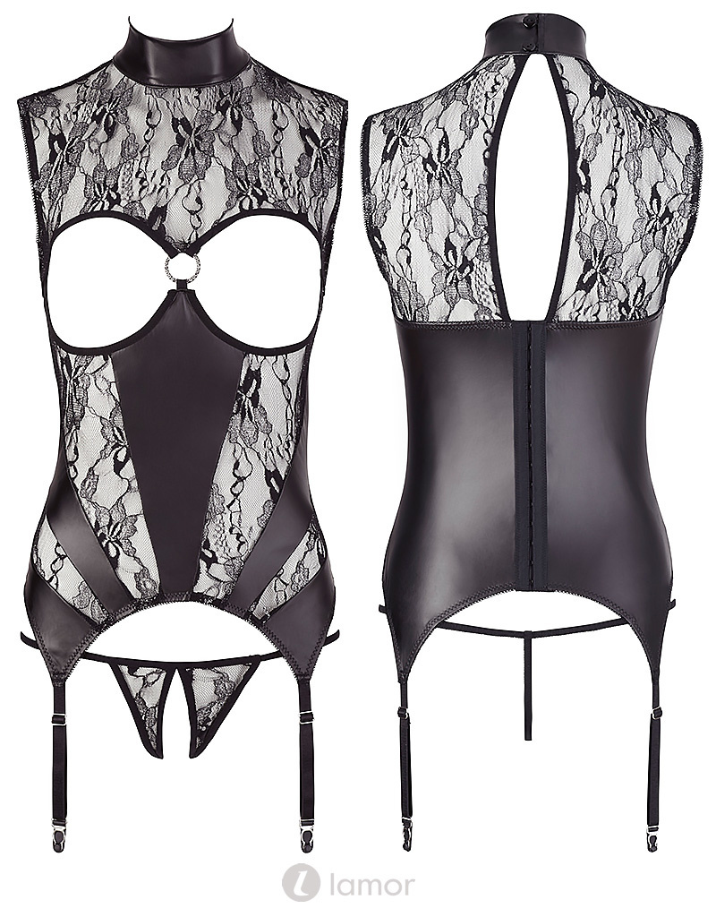 Borst-vrije korset met opstaande kraag en grote strass ring aan de voorkant. Sluit met een haaksluiting aan de achterzijde en 2 kleine knoopjes voor de kraag. De Jarretelle zijn in lengte verstelbaar. Gemaakt van tweekleurig bloemenkant, ingenieus gecombineerd met matte look stoffen delen. Het korset wordt geleverd met een bijpassende string.
