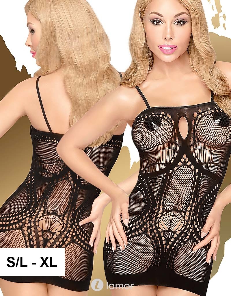 Het diepzwarte sexy mini-jurkje zit dankzij de zachte materialen nauwsluitend en zorgt voor een prachtig zandloper silhouet. Dankzij het netpatroon en de gaatjes heeft de jurk een elegante touch en een uitsparing aan de voorkant maakt deze look helemaal af. Naast de spaghettibandjes zorgt de vierkante halslijn voor een mooie halslijn.