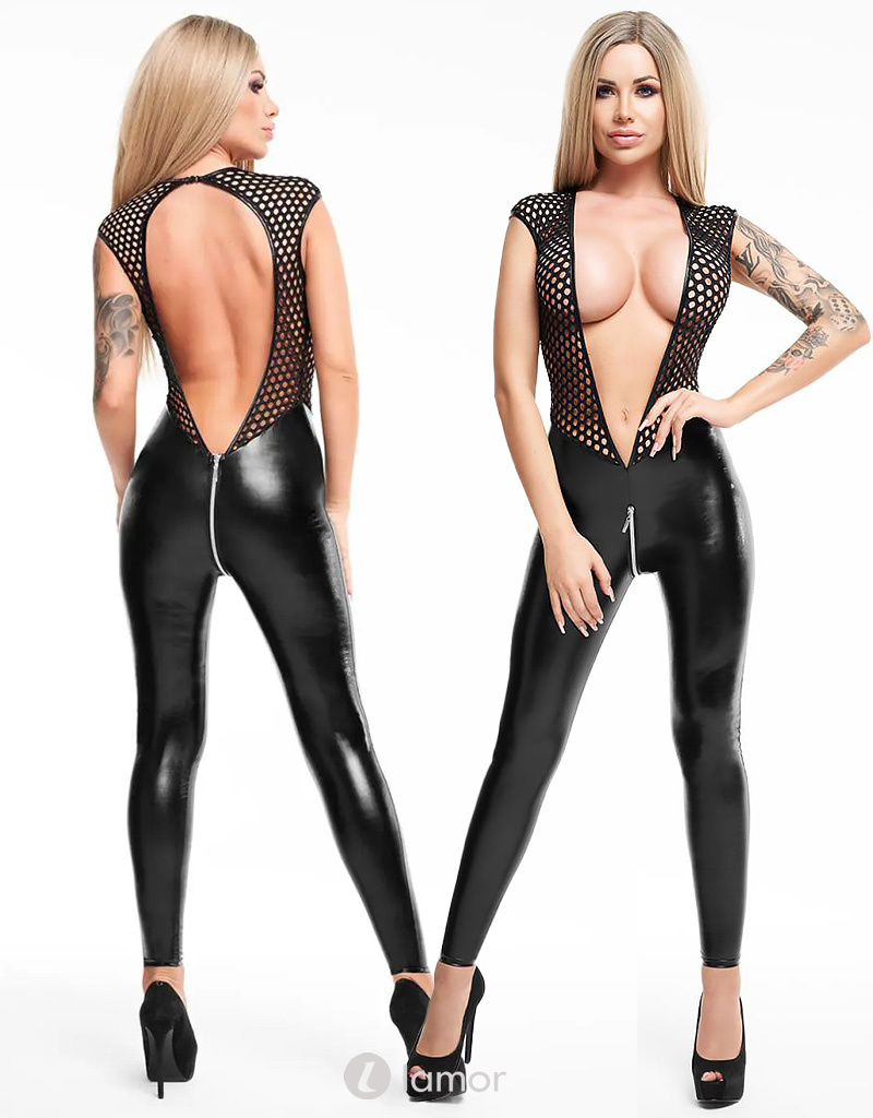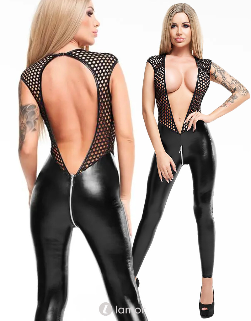 Sexy zwarte wetlook catsuit met diep decollete van 7-Heaven
