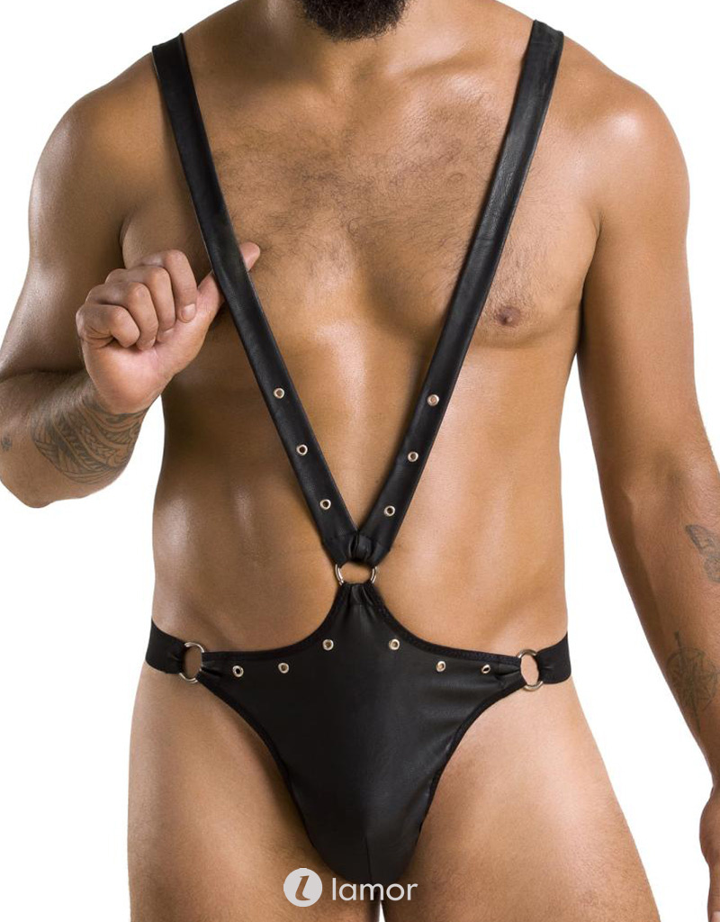 Sexy heren stringbody van lederlook materiaal van Passion Menswear